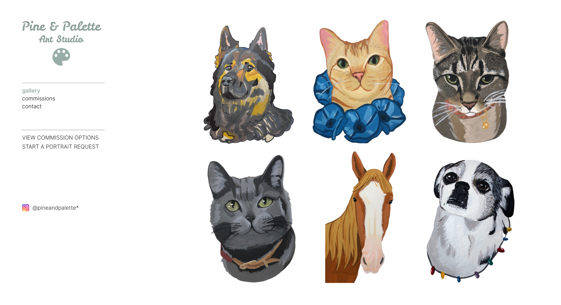- Grid of pet portraits showcases variety in style, subject, and medium. Each image serves as visual proof of quality for potential clients.